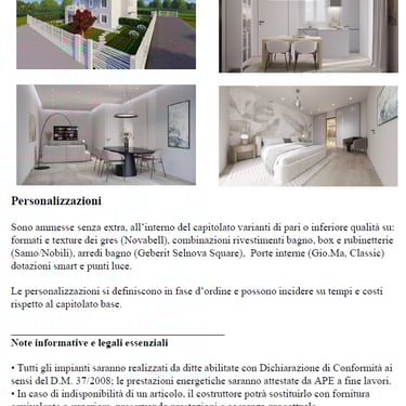 Le personalizzazioni richieste dall’acquirente dovranno essere approvate preventivamente, risultare compatibili con lo stato di avanzamento lavori e potranno comportare variazioni economiche da concordare caso per caso.
